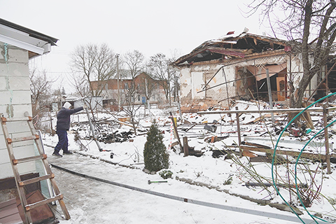 ◎ 一月十六日,在俄羅斯庫爾斯克州利戈夫,一名男子清理在烏克蘭軍隊襲擊中受損的房屋附近的垃圾。(新華社發 弗拉基米爾 攝)