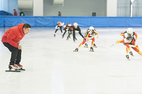 ◎ 在黑龍江省七台河市短道速滑館,七台河市短道速滑重點班主教練姚忠華正帶領運動員集中訓練。十五年來,姚忠華帶領隊員日復一日進行體能與冰上訓練。速滑館的冰面像一面鏡子,在姚忠華的帶領下,小隊員們面對這面「鏡子」,一面發現自己的價值、感受成功帶來的滿足感和自信心的提升,一面發現自己的缺點,積極尋求改進和成長的方向。七台河市擁有「奧運冠軍之城」的城市名片,截至目前共向省和國家輸送優秀運動員三百六十六人次。楊揚、王濛、孫琳琳、范可新等十四名冬奧和世界冠軍從這裡走出。在七台河市,姚忠華與其他教練員們一起築夢冰場,為我國冰雪人才的儲備奉獻著自己力量。(新華社記者 王松 攝)