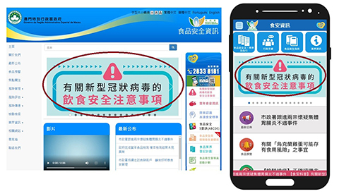 市政署已於食品安全資訊網開設「有關新型冠狀病毒的飲食安全注意事項」專頁,以及「預防食源性疾病,謹記食品安全五要訣(ABCDE)」專頁,公眾可登入www.foodsafety.gov.mo或下載「食安資訊」手機應用程式,獲取相關資訊。◇