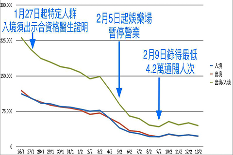 一月二十八日至二月四日的出入境人次持續遞減,二月四日全日的總出入境人次為十二萬一千。