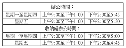 上述對外基本服務的受理時間為星期一至四(九時至十三時、十四時卅分至十七時四十五分)及星期五(九時至十三時、十四時卅分至十七時卅分),查詢可致電二八八八二0八八。