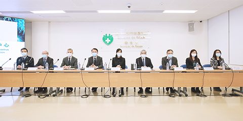 【專訪】新型冠狀病毒感染應變協調中心昨日舉行「新型冠狀病毒最新情況及本澳各項防控措施」新聞發佈會,社會文化司歐陽瑜司長、經濟財政司李偉農司長、經濟局戴建業局長、勞工事務局黃志雄局長、衛生局李展潤局長、仁伯爵綜合醫院李偉成醫務主任、疾病預防控制中心傳染病協調員梁亦好醫生、旅遊局執照及監察廳陳露廳長、治安警察局行動及通訊處馬超雄處長共同會見傳媒。