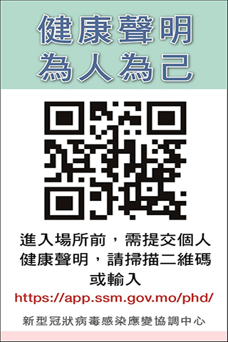 李展潤稱,今天上午九時可提供程式供市民使用,可在公共部門出入口掃描QR CODE進入頁面;程式有中,英、葡三語選擇,市民需填寫姓名、出生日期、身份證號碼和電話號碼,近期是否有到過其他國家或地區,以及有否相關症狀,提交時需以手機驗證碼確認手機號碼是否一致。