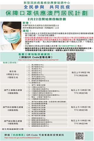 政府公佈第四輪口罩保障計劃今日開始啟動,發售地點和每天發售時間與第三輪一致。第四輪計劃亦提供兒童口罩,三周歲至八周歲可供應五個兒童口罩,另可購買五個成人口罩,或者全部十個成人口罩。衛生局傳染病防制暨疾病監測部協調員梁亦好表示,政府保證在供應期內有足夠口罩,呼籲市民不要急於購買。