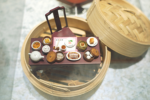 ◎ 裝在蒸籠裡的微縮作品「香港茶點」。(中新社張煒 攝)