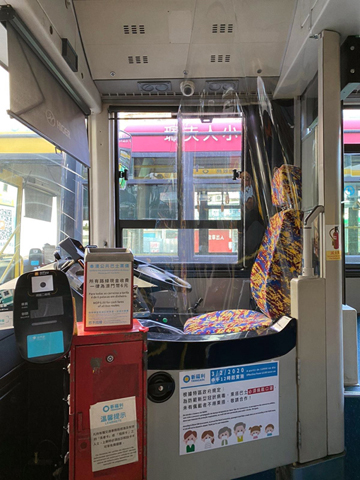 【特訊】為保障車長在防疫期間工作的安全,新福利日前為旗下逾三百部巴士車廂的車長駕駛位置加裝屏障,以減低病菌傳播的風險。屏障採用透明膠簾,在不妨礙車長視線和駕駛的環境下,能有效阻擋經由飛沫或接觸染病的機會。每逢巴士到達總站,站務員會噴灑消毒水清潔膠簾,晚上回廠後亦會進行深層清潔消毒,以確保細菌不黏附於表面。