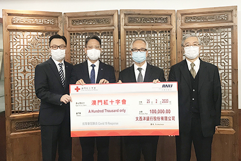 【特訊】為表示對本澳社群的持續關注及支援,而履行其企業社會責任,大西洋銀行向澳門紅十字會捐贈了十萬澳門元,以應對目前新型冠狀病毒肺炎的疫情工作。
