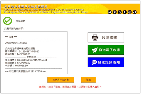 除透過新增的身份證明局多功能自助服務機繳費外,市民亦可通過市政署「公共地方總規章網上繳納罰款服務」網站、市政署「資訊服務亭」,或親臨市政署各服務中心、市政署法律及公證處、營地活動中心(只限涉及非澳門居民違法人士之個案)繳納罰款。
