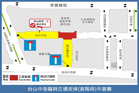 配合施工,交通事務局分階段實施臨時交通安排,首階段由本月十六日(周一)上午十時至四月四日(周六),蘇沙醫生街與花地瑪教會街之間一段台山中街封閉交通;蘇沙醫生街、白朗古將軍大馬路與蘇沙醫生街之間一段台山中街臨時改為無出口道路。9(往媽閣)路線巴士改道行駛,並臨時不停靠「台山中街」站,乘客可使用鄰近的「三角花園」站上落。