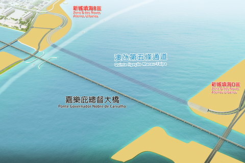 嘉樂庇總督大橋旁海底隧道全長二千四百多米,採用雙向六車道設計,速度為每小時六十公里。隧道將連接澳門新城填海B區和D區,接駁B區孫逸仙大馬路與城市日大馬路交匯處及D區東西向道路。項目除開展道路及隧道工程外,還包括建設照明系統、泵房等管理及維護設施。◇