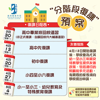 教育暨青年局教育研究暨資源廳廳長黃健武表示,經過研究和分析,特區政府已擬定非高等教育的分階段復課預案,預案的時間表如下:三月三十日高中畢業班回校溫習(非正式復課,自願回校升大輔導溫習);四月十三日高中教育階段復課;四月二十日初中教育階段復課;四月二十七日小學教育階段四至六年級復課;五月四日幼兒教育階段、小學教育階段一至三年級、特殊教育全面復課。