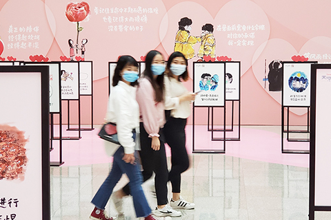 ◎ 本月十四日,參觀者在廣州天河城欣賞廣東漫畫家小林(林帝浣)創作的抗疫題材漫畫作品。(中新社王堅 攝)