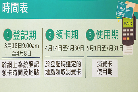 據介紹,有關登記期由十八日至下月八日(www.amcm.gov.com),領取期由下月十四日至三十日,使用期由五月一日至七月三十一日。其操作流程和資料要求參照生肖鈔,而考慮領卡人數較多,當局呼籲市民按選定的時間及地點領取消費卡。