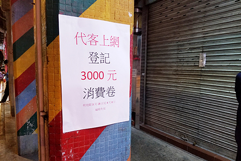 局方人員到場時發現懷疑的相關商舖已經關門,而店舖門外張貼了「代客上網登記三千元消費卷」字樣的標貼,經濟局將於今日再盡早派員跟進事件。