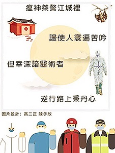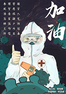 張柏恩老師是高中老師,也是高中「學以致用班」的導師,開展中華優秀傳統文化教育,提高學生對古詩詞的學習興趣,激發學生對中華優秀傳統文化的傳承信念。在教學活動中引導學生「舊學新用」古詩詞,並透過海報設計來一個跨媒介的結合,將古詩詞與現代生活、現代知識與思想聯繫起來,做到社情與知識點互相對話的教學目標,以「新冠肺炎」為題創作七言絕句。
