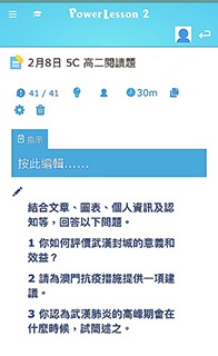 此外,高三的準畢業生面對升大考試,當中作文這一環對於學生來說是重要的一環,而材料作文更是公開考試中常見的類型,故老師在「停課不停學」期間設計了材料寫作主題學習,在eClass PowerLesson2及微信班群指導學生通過社情材料閱讀,掌握材料作文的常用法則,如主旨領悟法、中心句提煉法、因果追溯法等解讀材料,然後讓學生在電子學習平台上說明寫作思路,繼而寫出好文章,目的讓學生掌握材料寫作要點,同時思考生活,乃至觀察社會。
