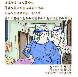 趙穎詩同學利用圖畫將醫護人員的無私奉獻形象化。同學認為抗疫是一段艱辛的路,而他們每天要和時間賽跑,不能停歇。所以在她的心中,醫護人員是這條路上的逆行者。