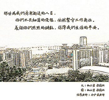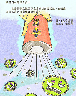 而梁倩欣和賴悅鋆同學,她們形容那些每天不辭勞苦的清潔員工,就像是一塊保護城市的護盾,為的是給澳門市民一個安心居住的環境。賴同學更描繪他們手中握著的消毒瓶,猶如揮動著的一把利劍,默默地為住民去除病毒。