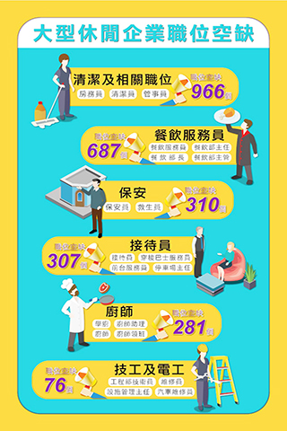 本澳大型休閒企業現時提供合共二千六百多個職位空缺,當中涉及清潔、餐飲服務員、接待員、保安、廚師及工程維修等職種。勞工局現正積極聯絡已進行就業登記的工友,進行配對,協助及穩定居民就業。