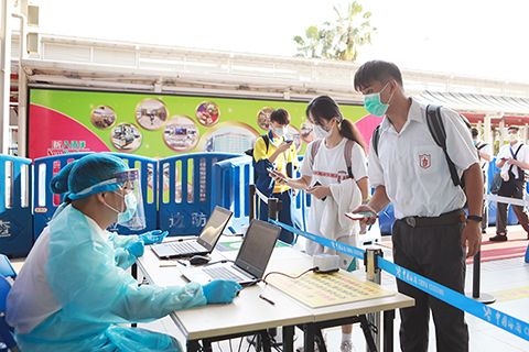 四日早上六時三十分開始,拱北口岸出境大廳外身穿校服的學生多了起來。有學生在路上已提前通過手機完成健康申報,關員引導其使用快速通道、出示手機申報記錄,關員驗核放行,驗核過程一般只需數秒。「從安全便捷等角度考慮,我們建議包括學生在內的旅客儘量使用『零接觸』的電子申報方式進行健康申報。」閘口海關副關長王遇春表示。
