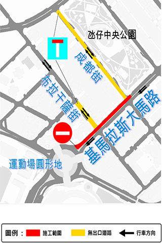 封閉交通:運動場圓形地與成都街之間、往成都街方向一段基馬拉斯大馬路。