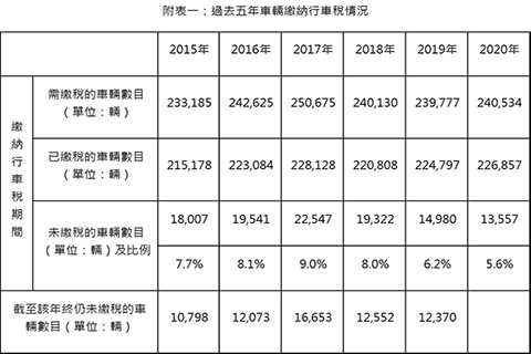【特訊】2020年度車輛使用牌照稅(俗稱「行車稅」)徵收期已於4月1日結束,全澳逾24萬部須繳納行車稅之車輛中,仍有13,500多部車輛未繳納,約佔5.6%,相對於2019年的6.2%及2018年的8%輕微下降(詳見附表一)。