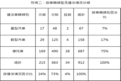 因應未繳稅車輛的情況,交通事務局於4月派出稽查人員在全澳各區進行稽查,共查獲912部車輛涉及「欠繳車輛使用牌照稅」(下簡稱:欠繳)、「沒有張貼車輛使用牌照稅標誌」(下簡稱:欠貼),以及「強制註銷車輛」(下簡稱:註銷)三種違法情況。當中,以欠貼最為嚴重,共663宗,約佔總體違法情況73%;其次為欠繳215宗,約佔24%。以車輛類型劃分,摩托車的違法情況最嚴重,共687宗,約佔總體違法車輛的75%(詳見附表二)。