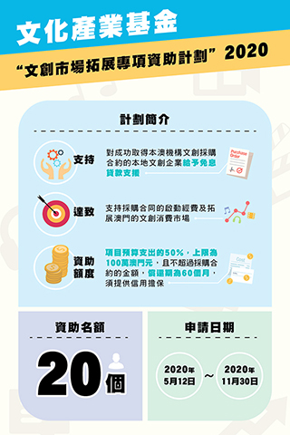 【特訊】因應新冠肺炎疫情對文創企業造成的影響,文化產業基金推出「文創市場拓展專項資助計劃」,向成功取得本澳機構文創採購合約的企業,提供最多二十個免息貸款的資助名額,支持企業開拓澳門的文創消費市場。