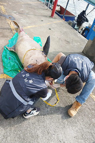 市政署接報後,即時安排人員到現場跟進。經檢查和初步測量後,確定該海豚屬雌性,體長約二點四米,暫未確定品種及年齡,須作進一步鑑定。屍體胸鰭及尾部有瘀傷,發現時腹部因有氣體而輕微膨脹。據獸醫解剖發現,胃內空無一物,亦未有見塑膠製品,具體死因須作進一步研究。