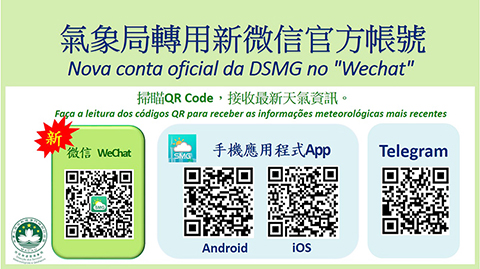 「澳門國際綜合旅遊文化區」第一場意見收集會 多關注項目建設時間表 聚焦AIE以「展會+考察+對接」模式 澳門招商局推動成果轉化 佛山市長白濤一行訪中總 就佛澳兩地經貿合作等交流 「澳門就業環境與青年理想工作」發佈會舉行 近半受訪青年從未職能培訓 「漢字互動節─見字如食」展覽開幕 「漢字文創產品設計專業賽」頒獎 逾廿五個商戶和美食攤檔參與 泰國文化節一連兩日舉行 調查顯示對國際事務關注度 澳門中學生屬中等水平 交通事故男電單車駕駛者經搶救不治 若目睹事故發生可聯絡警方 全澳現有二九一個風險斜坡 跨部門將加強巡查今年已完成五項加固工程 自來水利用內套管技術縮工期並降低交通影響 亞豐素街採非開挖式修水管 澳大辦「打造中西文明互鑑的文化金名片」研討會 探討文旅產業促澳經濟多元 多處工程採臨時交通安排 澳國際網球文協賀雙慶 同日晚宴頒獎並向兩機構致送善款 大灣區慈善網球賽推運動事業發展 衛局與澳門青年發展服務中心共同設定 心晴熱線全日提供心理諮詢 居民存款按月增加 貸款錄得跌幅 澳十月廣義貨幣供應量續升 俞心悅作品展本周二揭幕 推廣生物生態知識 市政署辦社區巡展及工作坊 全新設置「光影瀑布」與「光影走廊」 「二零二五幻彩夜關前」揭幕 莞澳法學界交流團訪律師公會 探討加強法律界合作 管協副理事長接任AAMO主席 今日本澳之空氣質量 預料會達至不良水平 衛生局率團出席第七屆灣區中醫藥傳承創新發展大會 第八屆大會明年於澳門舉行 澳門學聯第六十三屆理事長 蕭顯華當選連任 橫琴口岸智能「刷臉」通關首月 超六十四萬人次享便捷出行 澳門高校教職員赴復旦研習 深化對國家發展戰略與科創理解 勞工局舉辦有獎遊戲 持續推廣勞資權益資訊 全澳校際中學生憲法和基本法知識比賽頒獎 教業中學包攬初高中組冠軍 澳門國際光影節開幕 南灣、北區及新口岸打造三大光影展區 推動社區旅遊與夜間經濟 氣象局推出新微信帳號 2020-05-16 03:30:00 【特訊】因應業務發展與微信粉絲用戶不斷增加,地球物理暨氣象局早前推出了新微信官方帳號「澳門地球物理暨氣象局SMG」,以配合服務發展;同時舊版微信官方帳號「澳門氣象局SMG」將於本月三十一日起停止提供服務。 本澳已進入雨季,颱風季亦即將來臨,氣象局提醒還未關注新微信官方帳號的用戶及市民盡快關注,以便及時收取最新天氣資訊。此外,市民亦可以透過安裝氣象局手機應用程式、在Telegram訂閱氣象局頻道,接收最新天氣資訊。◇