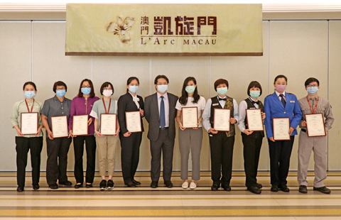 澳門凱旋門「季度最佳員工」是由員工所屬部門主管以「服務態度」、「團隊精神」、「責任感」及「自發性」等評審準則嚴格甄選而出。「二零二零年第一季度最佳員工」十位得獎者分別是:餐飲部-毛玉芹、客務部-金瑩瑩、管家部-覃憶梅、工程部-李棟文、財務部-彭安琪、資訊科技及影音部-胡煒湧、娛樂場運作部-賴彩萍及楊潔清、娛樂場保安部-張妮、籌碼兌換處-梁超亮,由澳門凱旋門財務總裁梁文傑頒發獎狀及餐飲禮券以示鼓勵,他感謝員工對公司所作出的貢獻,期望得獎員工繼續努力,與公司一同攜手邁步向前。