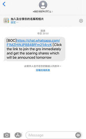 【特訊】司法警察局本局近日接獲多名市民反映,稱其手機接收到由本地手機電話號碼發出的一條短訊,內容為:「[BOC]https://chat.whatsapp.com/F1MZHWJP884BfFm21i4rzK [Click the link to join the gro immediately and get the soaring shares which will be announced tomorrow」(「BOC」意指一間本地銀行),大致意思為點擊短訊內連結便可得到將大幅上漲的股票股份,該局接報後已向相關銀行查證,確認其從未向市民發出過上述短訊,懷疑涉及電訊詐騙。