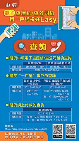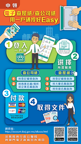 是次擴大網上申領電子書面報告的服務對象,是法務局與行政公職局電子政務跨部門的合作項目,主要目的是方便市民,讓市民無需外出亦能申領。凡已開立行政公職局「一戶通」的市民,可透過「一戶通」的網頁版或手機應用程式,又或法務局的專屬網頁(https://account.dsaj.gov.mo/eBusca.html)來申請電子版的物業登記書面報告及商業登記書面報告,申請完成後隨即進行網上付款,市民可使用「VISA信用卡」、「MASTERCARD信用卡」、「中銀e網」或「銀聯在線支付」等方式支付,便即可獲取電子版「查屋紙」或「查公司紙」。◇