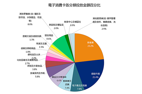 零售行業方面,超級市場為零售業中交易額佔比最高的版塊,佔零售業的百分之三十點一,同時亦佔全部總交易額的百分之二十一點四,而電子產品及電器、服飾及皮具、藥品及參茸海味、家禽菜肉及市販等商戶的消費額,分別佔總體消費卡交易額的百分之七點八、百分之七點四、百分之六點六及百分之五點八。