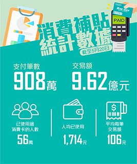 根據交易統計資料,已有五十六點一萬人使用過消費卡,人均已使用約一千七百一十四元,超過百分之五十八的消費卡已被使用超過一半的消費補貼。為更好地對消費卡的使用情況進行分析,經濟局對各行業的商戶類別進行了更細緻的劃分,數據反映多個行業均有不同程度的受惠,分析結果簡要如下: