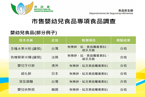 現時市面上供嬰幼兒食用的輔助食品種類繁多,由於嬰幼兒正處於高速成長發育階段,身體器官尚未發育完全,倘若長期進食受污染的食品,可能會對嬰幼兒健康造成不良影響。為此,是次專項調查中,市政署分別抽取本澳百貨公司、超級市場、嬰幼兒用品店等出售的嬰幼兒食品,包括穀物糊、餅乾、果汁等,並進行重金屬和真菌毒素的檢測。當中重金屬檢測項目包括:無機砷、鉛、總汞及錫,真菌毒素檢測項目包括:黃曲霉毒素B1。調查結果顯示,所有樣本均未見異常。