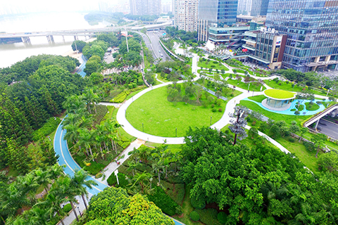 福州市在江濱路上空打造五萬平方米的「空中公園」,該公園將二百畝的閩江公園「濱江森林」和八十七畝的市民廣場「城市綠谷」連為一體,形成總面積超過二十萬平方米的「現代城市綠肺」,並與中央商務區內的福州市圖書館、融僑中心、福州國際金融中心、三迪聯邦中心相接,打造形成現代城市生態商務景觀區。◇ (中新社)