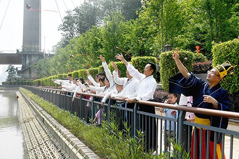 活動現場再現了端午祭屈原儀式,兩岸婚姻家庭代表與嘉賓們面對江面行禮敬拜、拋粽子,按最傳統的儀式敬拜屈原,通過講解和親身體驗相結合的方式,讓兩岸同胞特別是青少年學習傳承端午節文化、感受人文歷史。