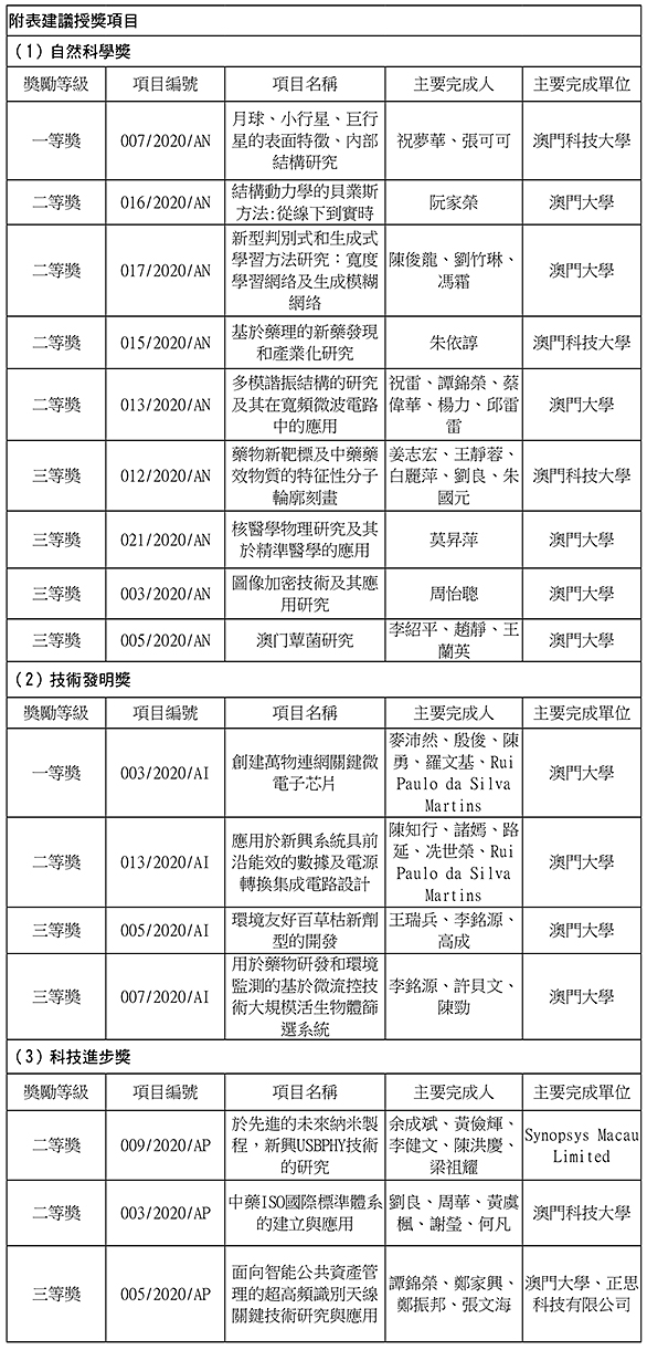 【特訊】根據第六/二0一一號行政法規《科學技術獎勵規章》,澳門科學技術獎勵的評審工作每兩年進行一次。因受新冠肺炎疫情的影響,二0二0年度澳門科學技術獎評審會議採取網絡會議方式,已於本月十八至十九日舉行。建議授獎項目見附表。