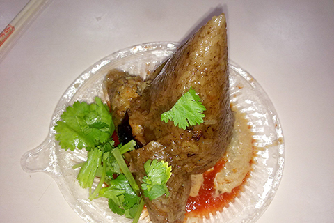 煮粽過程也「香」得益彰,母親將粽子裹上新鮮粽葉,紮緊棕繩,讓水沒入整鍋,再用蒸籠煮透煮爛,使米和葉水乳交融。蒸籠上白濛濛的水蒸汽,從鍋蓋兩旁不斷地逸出,周身盈滿一陣陣粽葉清香。廚房裡溢滿香味,饞得我直咽口水。彼時,母親總會唱:「排排坐,吃果果……」糯米吸納粽葉的清香,散發出令人垂涎的魅力。當鍋蓋被揭開的刹那,團團水蒸汽升騰瀰漫。粽子取出後,母親就用剪刀,熟練地剪下一粒素粽,剝開來用筷子夾一小口,吹涼之後,塞進我的嘴裡。然而,此刻的我便嚷嚷著:「我自己來剝!」「小心燙嘴!」「知道,知道!」抓在手上的粽子,一股清香撲鼻而至。母親迅速剪開繩剝了粽葉,露出粽肉晶瑩似咖啡色玉雕,玲瓏剔透,光澤欲滴。我迫不及待咬一大口,「哇!好燙」。但我很快忘了燙,因為這香氣裡有艾草的幽草香,有葦葉的清新悠遠,有大棗的甜香沁心,有糯米的你儂我儂……
