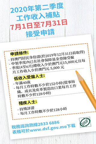 【特訊】今年第二季工作收入補貼將於今(一)日至七月三十一日接受申請,本年度申請對象放寬至澳門非永久居民。凡年滿四十歲、於申領補貼季度內已在社會保障基金登錄為受僱人士,以及持澳門特別行政區居民身份證(須於去年十二月三十一日或以前取得),只要每月工作不少於一百五十二小時,或從事紡織、成衣及皮革產品製造出口業每月工作不少於一百二十八小時,且該季度工作收入少於澳門元一萬五千元及每月工作收入少於澳門元五千元,均可申請工作收入補貼。