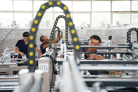 ◎ 七月一日,湖北省赤壁市,工人在車間忙碌。赤壁市萬皇智能設備有限公司是一家製造全自動生產線設備的小微企業。今年年初以來的新冠肺炎疫情對該企業亦有影響。原先的訂單、供貨關係及生產計劃被打亂,但疫情推動了不少產業「機器人化」,推動了生產線向全自動化升級,這給該企業帶來了訂單量的巨大增長。今年前六個月,該企業訂單銷售額已達三千萬元,與去年全年的訂單額持平;前六個月納稅額二百一十四萬元,也呈現大幅增長。(中新社)