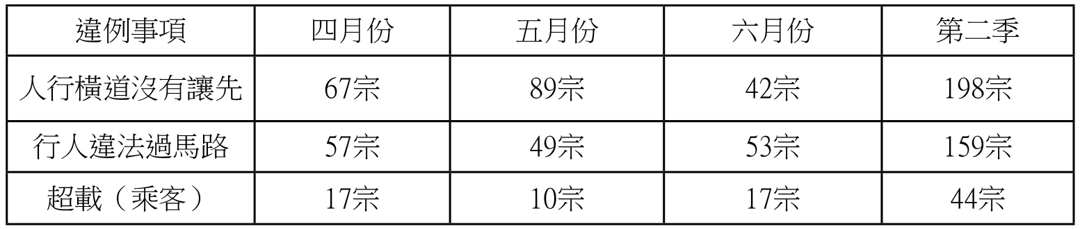 【特訊】治安警察局持續在本澳各處開展監察及打擊交通違規行動,二0二0年第二季就行人違法過馬路、人行橫道沒有讓先及超載(乘客)之檢控數據如下: