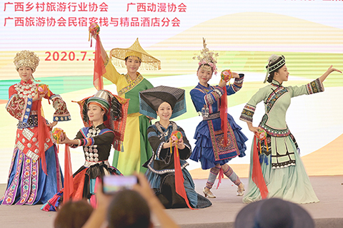◎ 七月十七日,二0二0廣西全域旅遊大集市在南寧國際會展中心舉行,展會以大集市形式,劃分多個區域集中展示了廣西多地的特色美食、旅遊項目、文創產品,並通過「非遺」民俗風情節目展演、花山岩畫VR體驗等互動方式吸引市民。圖為民俗風情節目展演。(中新社 俞靖 攝)