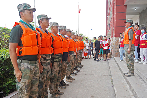 ◎ 七月十二日,山西省孝義市的退伍老兵原鵬帥得知江西鄱陽縣發生嚴重洪澇災害。「作為退伍老兵,我應該做點甚麼!」原鵬帥第一時間聯繫戰友,組成由十名退伍老兵參加的抗洪志願隊。從山西到江西,一千三百多公里,退伍老兵志願隊自駕馳援江西鄱陽抗洪一線。經當地志願者介紹,他們駐紮在受災群眾較多的鄱陽縣三廟前一中安置點,幫助清運垃圾、防疫消毒、照顧老人與孩子。到達鄱陽縣的第二天,原鵬帥就與武警江西總隊機動支隊取得聯繫。經批准後,退伍老兵們加入了在昌江圩堤抗洪搶險的隊伍。巡堤查險、裝運沙袋、加固堤防,老兵們的衣服被汗水和泥水浸透,又被烈日和體溫烘乾。面前是洶湧的洪水,身後是老鄉的家園,十名老兵一直堅守在昌江圩堤上。圖為在江西鄱陽縣三廟前一中安置點,退伍老兵志願隊集合準備出發執行任務(七月十八日攝)。(新華社)