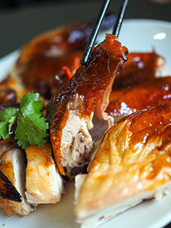 作為店內招牌之作,所以絕對不會是馬虎對待;師傅一天前就為走地雞落功夫、施法術,吊燒的時候更要受到師傅的嚴格監控,確保雞隻受熱平均,才會得出皮脆肉嫩到令人眼泛淚光的效果。