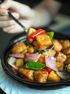店家沒有走上捷徑,拒絕使用能在超級市場輕易買到的玉子豆腐,反而不厭其煩地以新鮮黃豆磨漿隔渣後再加入雞蛋自製,玉子豆磨成品嫩滑清香,再注入與三杯雞同步的調味,即成無肉主義人士的惹味菜品!
