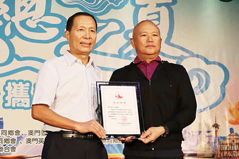 陳明金向承辦方澳門晉江同鄉會會長姚文衷頒發活動紀念證書,感謝該會承辦首場活動,弘揚中華文化,凝聚正能量,為攜手抗疫提振精氣神。冀更多的社團和市民積極參與,透過文化活動凝心聚力,為澳門抗疫情再出發提信心。