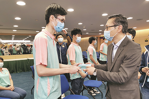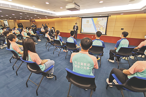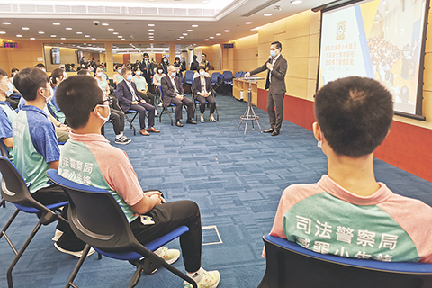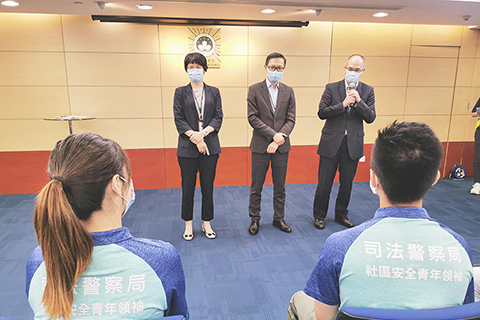 本月二十四日下午,司警局局長薛仲明、兩位副局長杜淑森及陳堅雄、社區警務及公共關係處處長鄭寶湘和關注少年組人員,與五十位上述兩項青年計劃的學員代表在司警局總部大樓相聚一堂,期間全體出席人員嚴格遵照特區政府的防疫指引,佩戴口罩、保持安全距離。