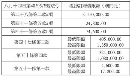 相關調整是經社會協調常設委員會勞資雙方考慮社會發展狀況及通貨膨脹率,以及聽取勞工事務局及澳門金融管理局的意見後,雙方均認同損害賠償限額有需要且具條件作出調升,並建議賠償限額的調升幅度分別為:每名僱員特定給付上限調升百分之五;假體安裝、假體維修及喪葬費上限調升百分之五點一;喪葬費下限調升百分之五點六;長期無能力(包括絕對及部份無能力)損害賠償上限、長期絕對無能力損害賠償下限、死亡上限及下限均調升百分之八。因應有關賠償限額的調升,經聽取澳門保險公會的意見後,有關的保費將調升百分之二。透過多項賠償限額調整,政府相信將對因工作意外或職業病而失去全部或部份工作能力的僱員及其家屬提供更大的保障。